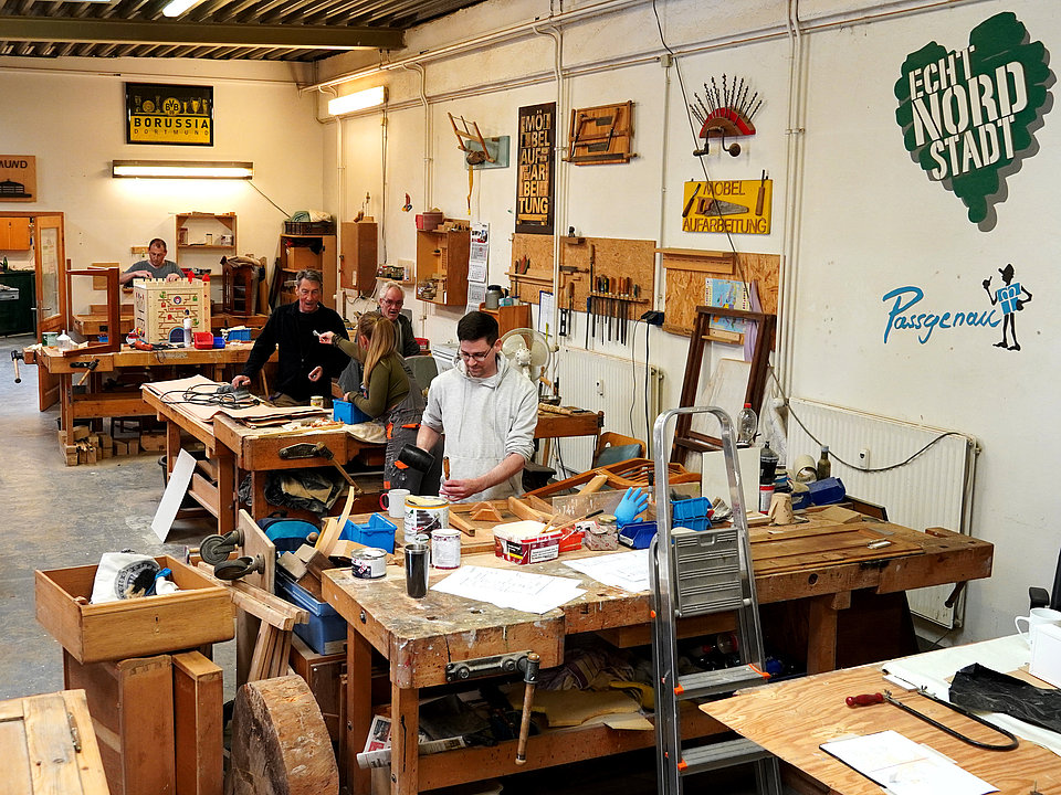 Vor Ort werden die Spenden von Teilnehmern im Rahmen einer Arbeitsgelegenheit (AGH) in Zusammenarbeit mit dem Jobcenter Dortmund zerlegt und recycelt.