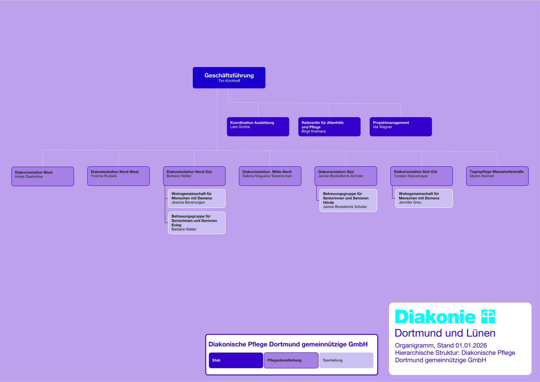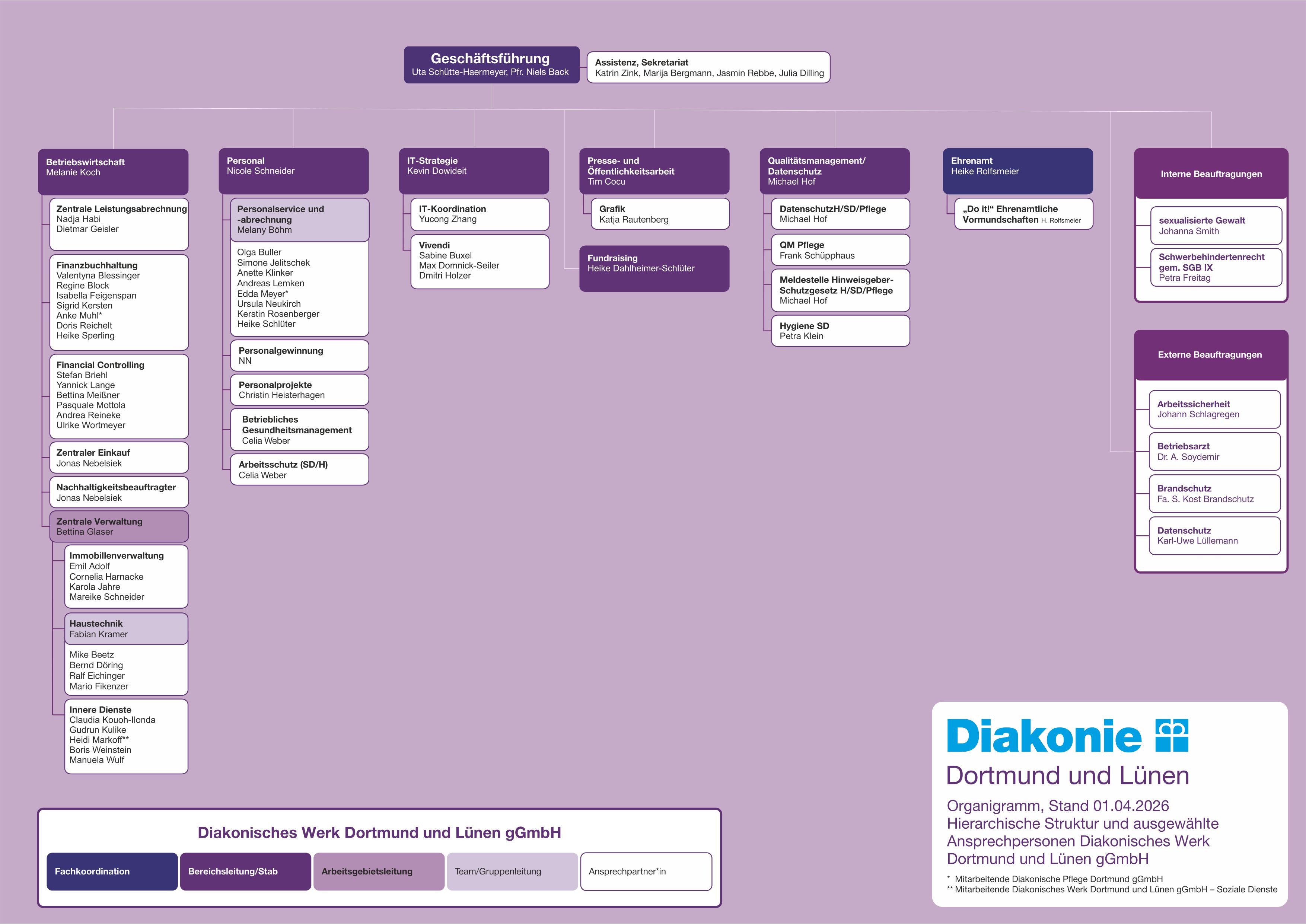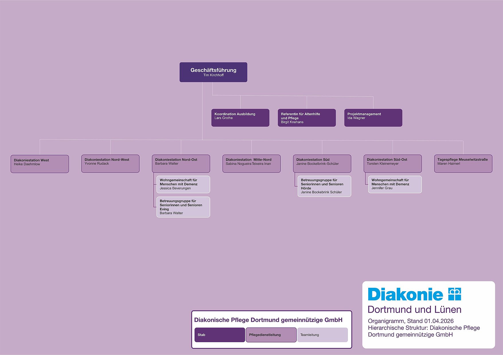 Die Konzernstruktur der Diakonie in Dortmund und Lünen gliedert sich in das Diakonische Werk Dortmund und Lünen gGmbH als Holding mit zwei Tochtergesellschaften: Die Diakonische Pflege Dortmund gemeinnützige GmbH und die Diakonisches Werk Dortmund und Lünen gGmbH – Soziale Dienste. Darüber hinaus ist die Diakonie in Dortmund und Lünen an der Diakonischen Altenhilfe Dortmund und Lünen gGmbH beteiligt. Die Diakonie Dortmund und Lünen ist Mitglied der Diakonie Rheinland-Westfalen-Lippe, dem zuständigen Spitzenverband der freien Wohlfahrtspflege.